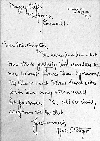 The mystery of the letter written by Marie Stopes from ‘Mayjoy Cliffs, Polperro’ and now on display in the Portland Museum, Dorset, has at last been solved thanks to a chance encounter with her grandson, Christopher Stopes, this summer.